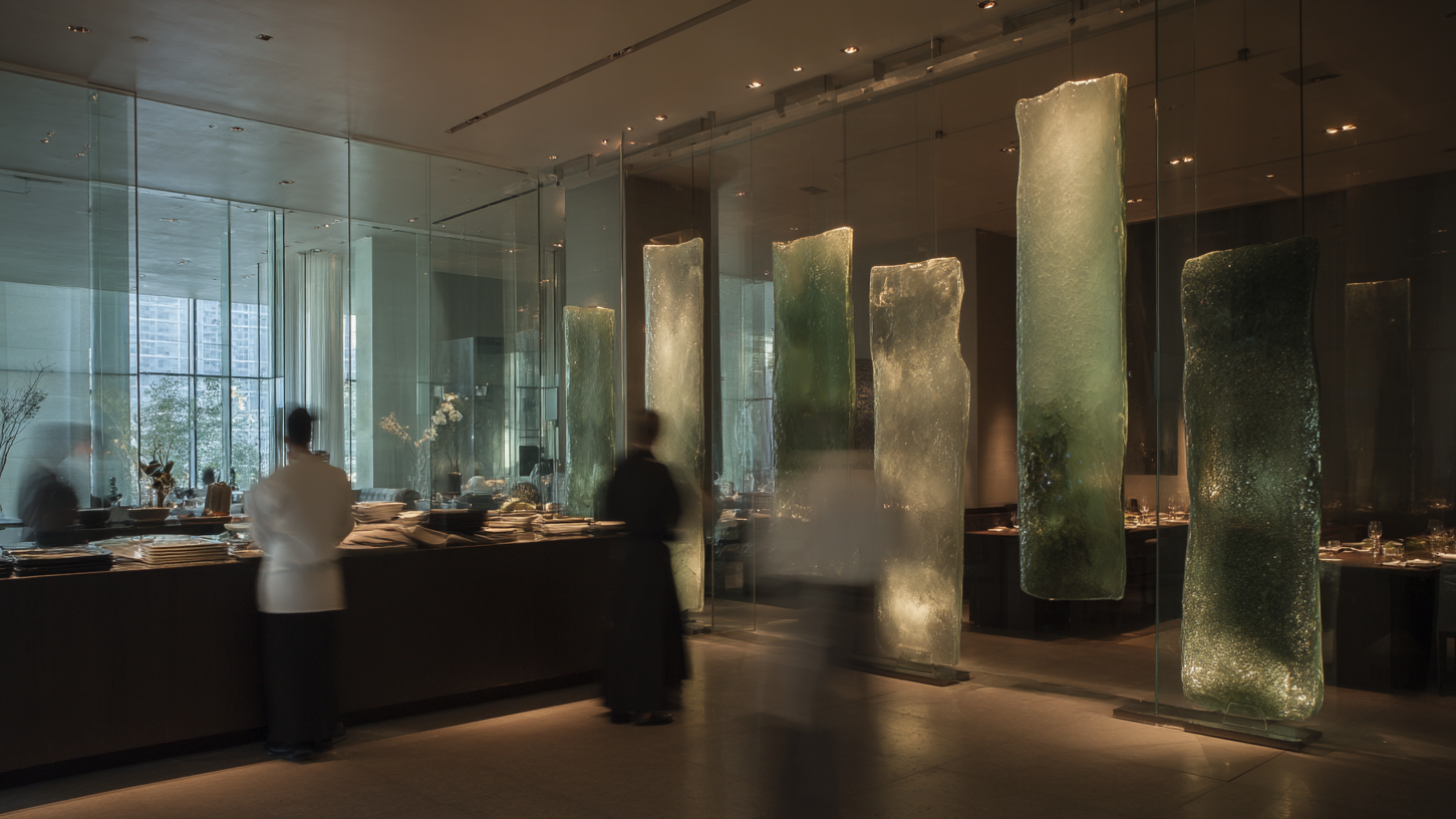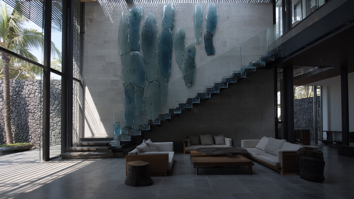 Hvert projekt tager udgangspunkt i rummets formål og bearbejdes både analytisk og sanseligt. I detaljen viser materialets indre liv sig. Strukturer og inklusioner balancerer mellem kontrol og spontanitet. Fine tråde og luftlommer skaber dybde i materialet.